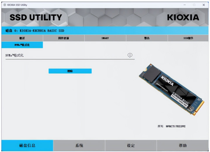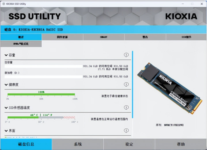 铠侠为旗下固态硬盘提供了官方配套工具——铠侠SSD Utility,该软件的核心价值在于硬盘状态监控与基础维护,界面简洁直观,操作门槛较低。在软件主页面,可实时查看铠侠SF10的序列号、已用容量、健康状态及当前温度等关键信息,帮助用户全面掌握硬盘运行状态。